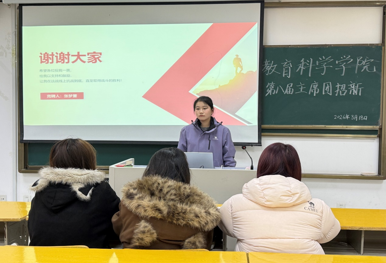 本次招新面试设置竞选演讲与评委提问两大环节,流程规范、安排有序。竞选现场,学生们依次登台围绕个人优势与竞选初衷,结合自身工作实践经验和专业特长,条理清晰地阐述了对主席团工作职责的理解认知,充分表达了服务同学、助力学院学生工作发展的坚定决心。“我认为主席团是学院学生工作的核心协调者,既要做好老师与学生间的桥梁纽带,精准传达学院要求,又要及时反馈大家的需求,让沟通更高效顺畅。”小学教育专业2025级2班张梦蕾的发言获得了现场评委的一致肯定。