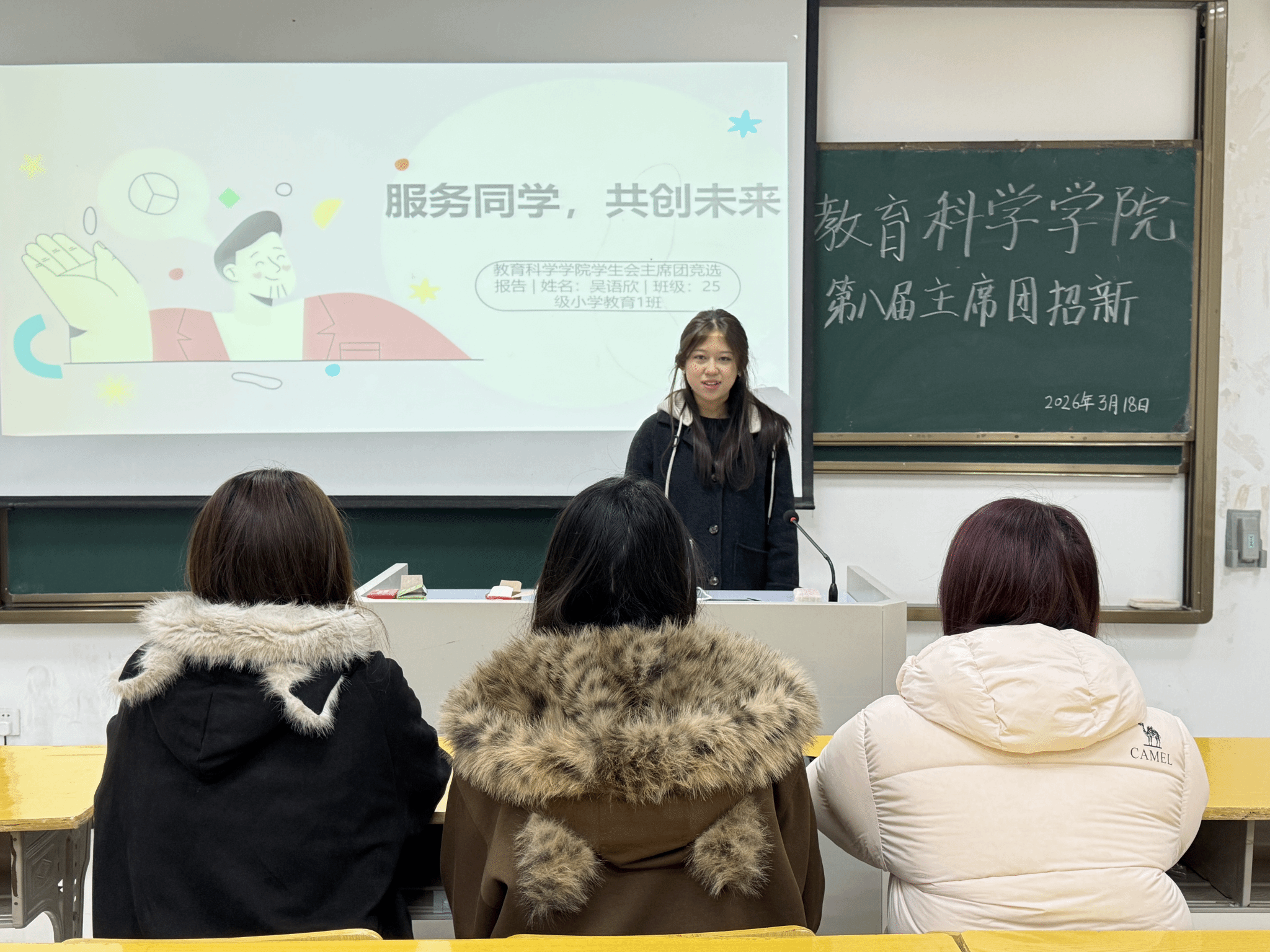 3月18日,我院于J214教室开展第八届主席团招新活动。主席团主席助理郜雨蒙、马春蕾、王思童担任招新评委,我院学子积极参与竞选。